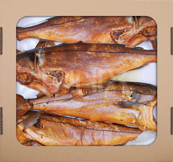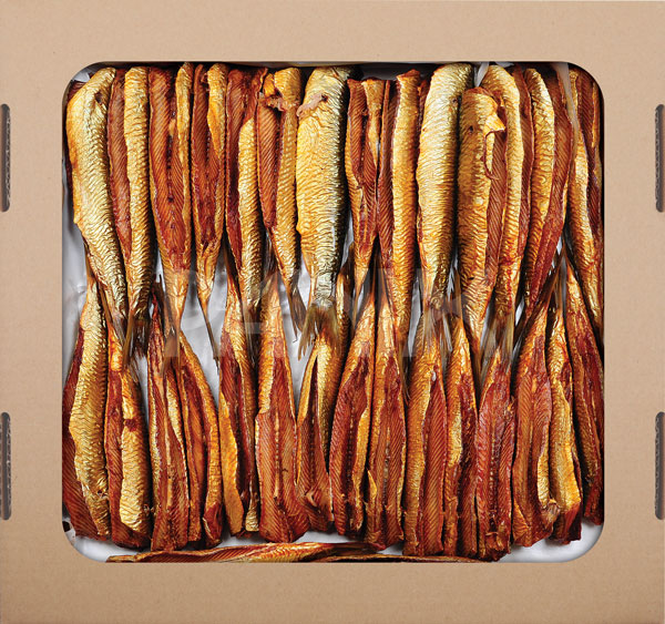 Hareng entier (avec la tête et les gonades). Salé et fumé naturellement.