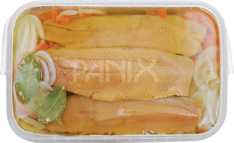 Morceaux de filet de saumon sans peau, paprika et cornichon marinés.
