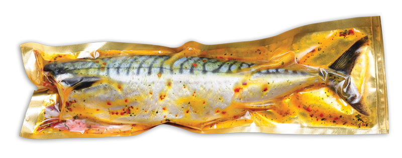 Maquereau décapité et évisceré, bien imbibé dans une marinade dense faite de l'hule de colza aux épices aromatques et piquants. Individuellement paqueté au vide.