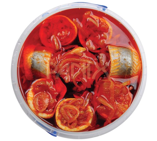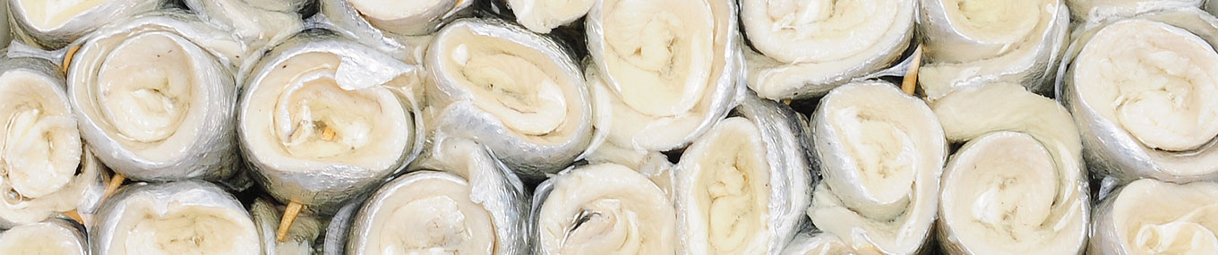 Filetto di aringa marinata, senza pelle, arrotolato con cipolla fritta insieme al concentrato di pomodoro e condimenti; in olio di colza