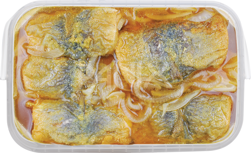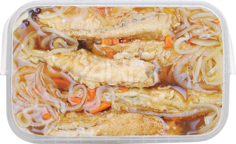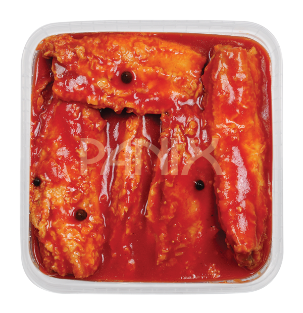 Płat śledziowy panierowany i smażony; w aromatycznym sosie pomidorowym własnej produkcji.